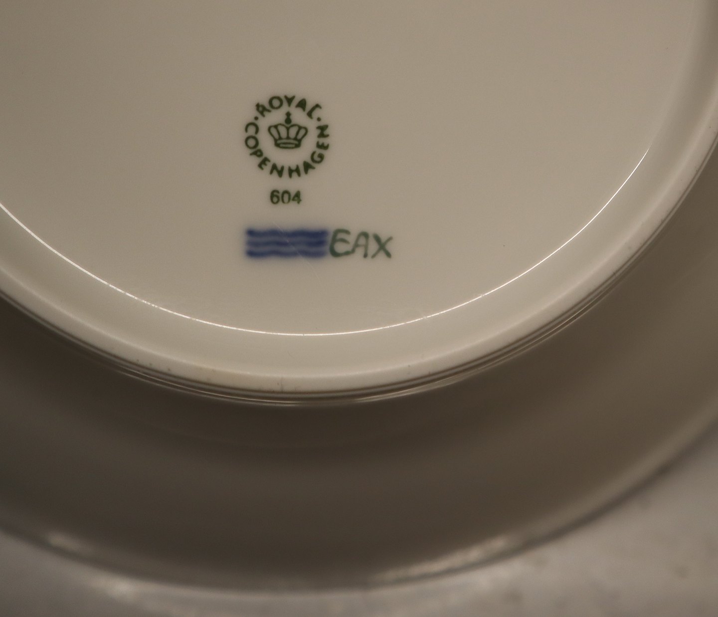 604 Stor dyb tallerken 6 x 24.5 cm Grøn Elements Royal Copenhagen Musselmalet. Muselmalet Grønt. I fin og hel stand. Passer godt sammen med andre blåmalede spise- og kaffestel. Design Louise Campbell