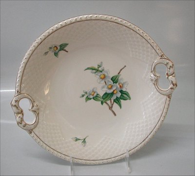 Beskrivelse: Bing & Grøndahl Heimdahl 101 Fad med hank 26,5 cm (304) - kremefarvet porcelæn med guldkant dekoreret med Jasmin - ikke at forveksle med Æbleblomst I fin og hel stand