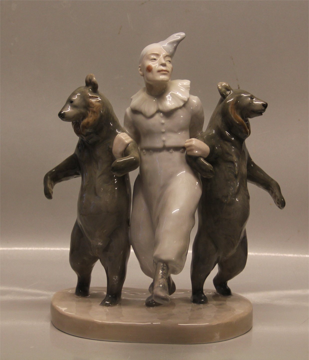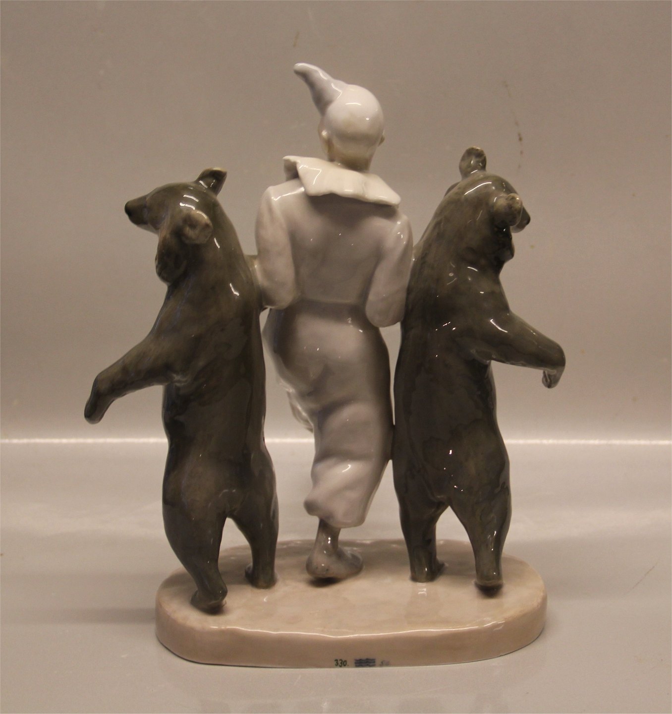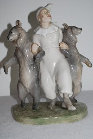 Beskrivelse: Kgl. 330 Kgl. Klovn og 2 Dansende bjørne 30 x 25 cm Signeret Carl. J. Bonnesen 1899 CJB fra Royal Copenhagen 1. sortering I hel og fin stand men med sædvanlige støttemærker under bjørnes "arme" se billeder