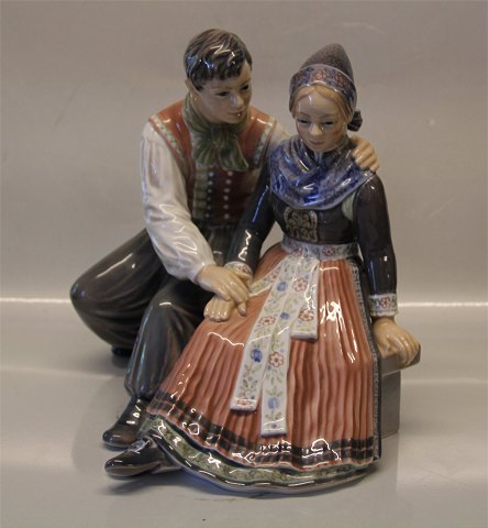 Beskrivelse: Dahl Jensen. 1220 Frieri 28 cm Frierscene Amager-dragter Mærket med kongelig krone og DJ Copenhagen i hel og fin stand. 1. sortering