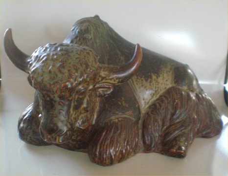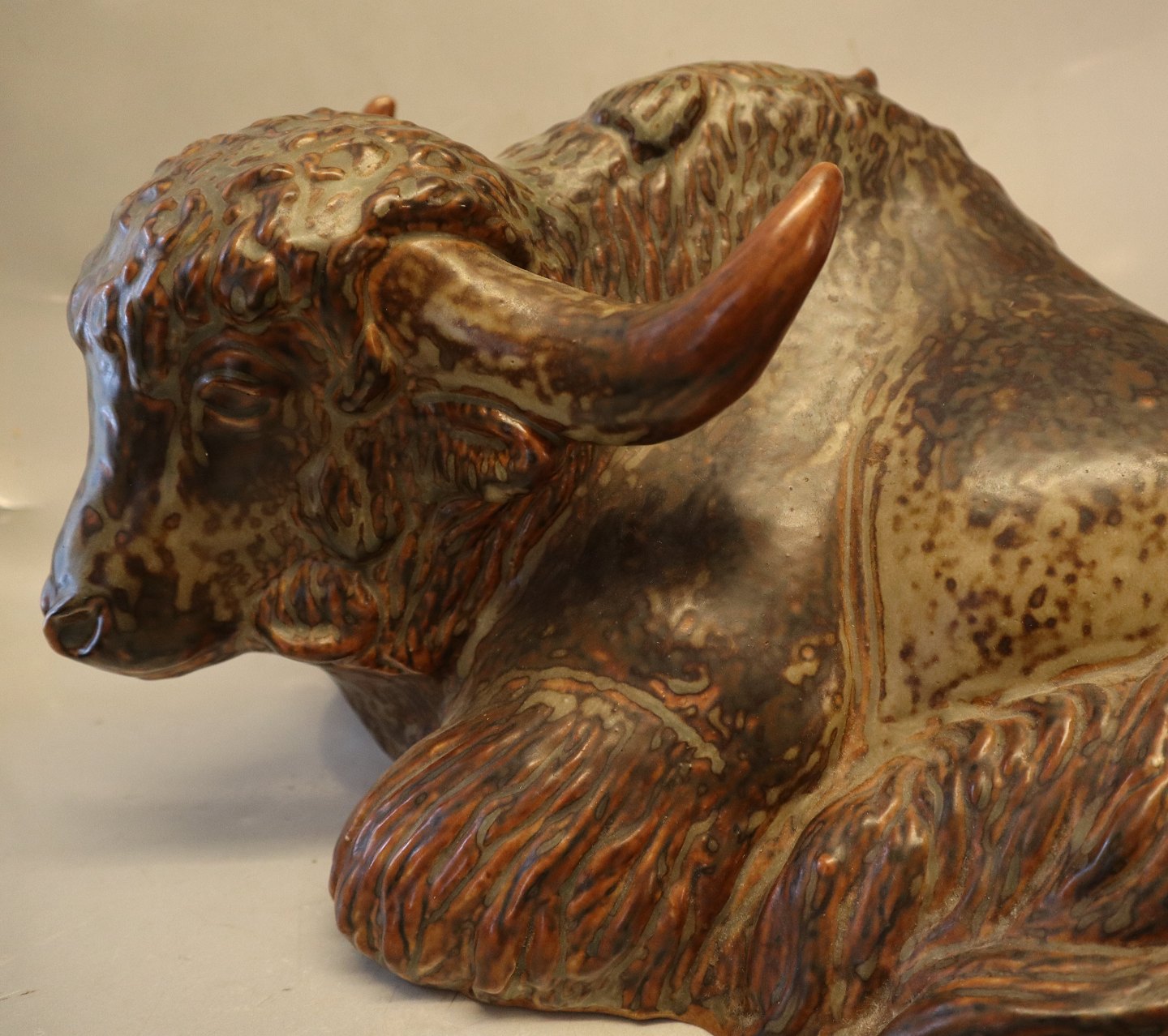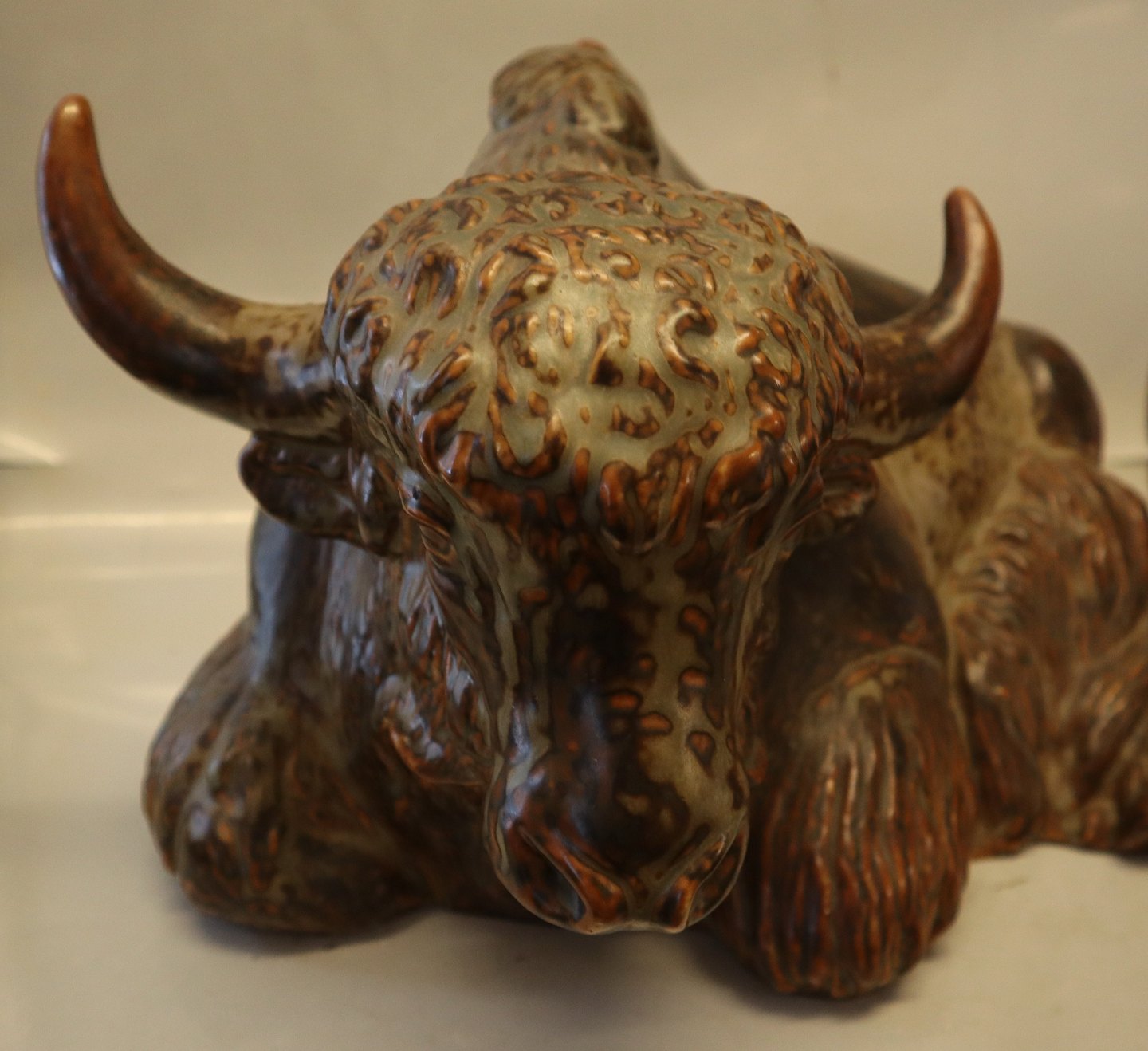 Beskrivelse: Royal Copenhagen stentøj 20789 Kgl. Yak Okse liggende 48 x 26 cm Karl Larsen januar 1947 nr 9 ud af 15 stk I fin og hel stand
