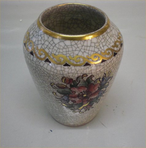 Beskrivelse: Dahl Jensen Craquelé . 60 DJ Vase med blomster og guld på grå bund 10 cm Krakelé-glasur mærket med kongelig krone og DJ Copenhagen i hel og fin stand.