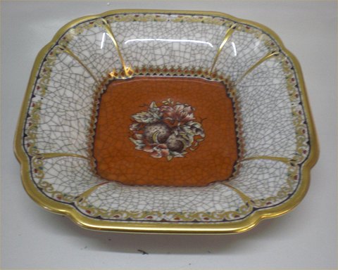 Beskrivelse: Dahl Jensen Cracquelé 188-617 DJ Fad, rødt med blomster på gråt 25.2 x 25.2 cm. Krakelé-glasur mærket med kongelig krone og DJ Copenhagen i hel og fin stand.