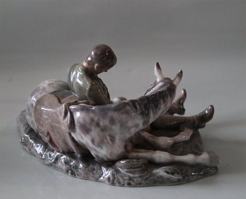 Beskrivelse: Dahl Jensen 1271 Såret soldat med hest (Lauritz Jensen) 25 cm. Mærket med kongelig krone og DJ Copenhagen i hel og fin stand.