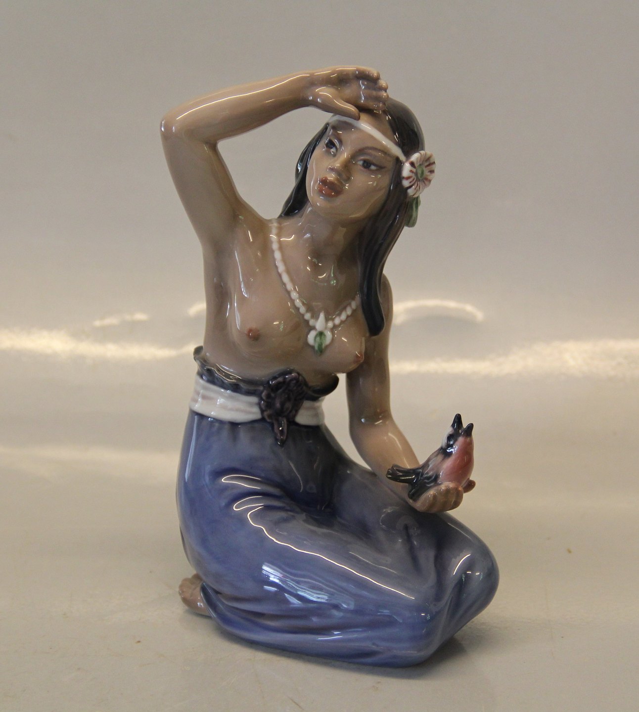 Description: Dahl Jensen 1268 Hawaiian girl with bird (DJ) 16.5 cm Marked with the Royal Crown and DJ Copenhagen. In nice and mint condition Dahl Jensen Worked first for Bing & Groendahl B&G from 1897