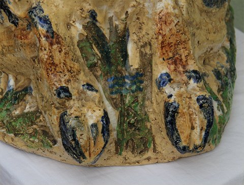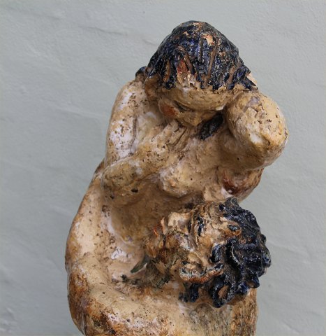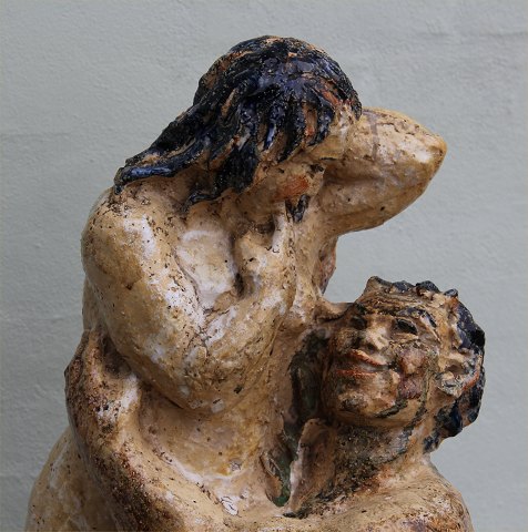 Beskrivelse: Den ultimative faune figur af Knud Kyhn er denne unikke gruppe af en faun der omfavner nøgen kvinde, mens han knælende ser begejsret op på hende. Man kan tydeligt se de karateristiske faunetræk: hove, hale og små horn. Skulpturen er mærket med den Kongelige Porcelænsfabriks tre bølgelinier, KK signaturen og 1931. Den måler ca 71 x 50 cm og vejer ca 33 kg selv om den er hul inden i. Dekorationen er i lette, klare farver i modsætning til den tradtionelle sung glasur og der er hvad man må forvente af udekorerede områder og krakkeleringer, samt et mindre afslag. Den vil krone enhver samling af Faune eller Kyhn figurer.