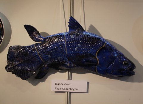 Billedhugger Jeanne Grut har ladet sig inspirere af Coelacanthen og har modelleret en relief skulptur af denne fisk. Det blåglaserede stykke giver beskueren et overvældende indtryk af en forunderlig ting - et levedygtigt fossil - en virkelig fabelfisk - en dyrefigur, som næsten må have levet siden verdens skabelse,
