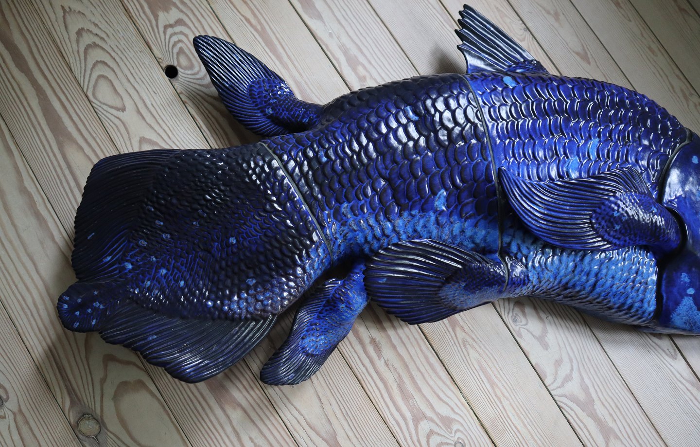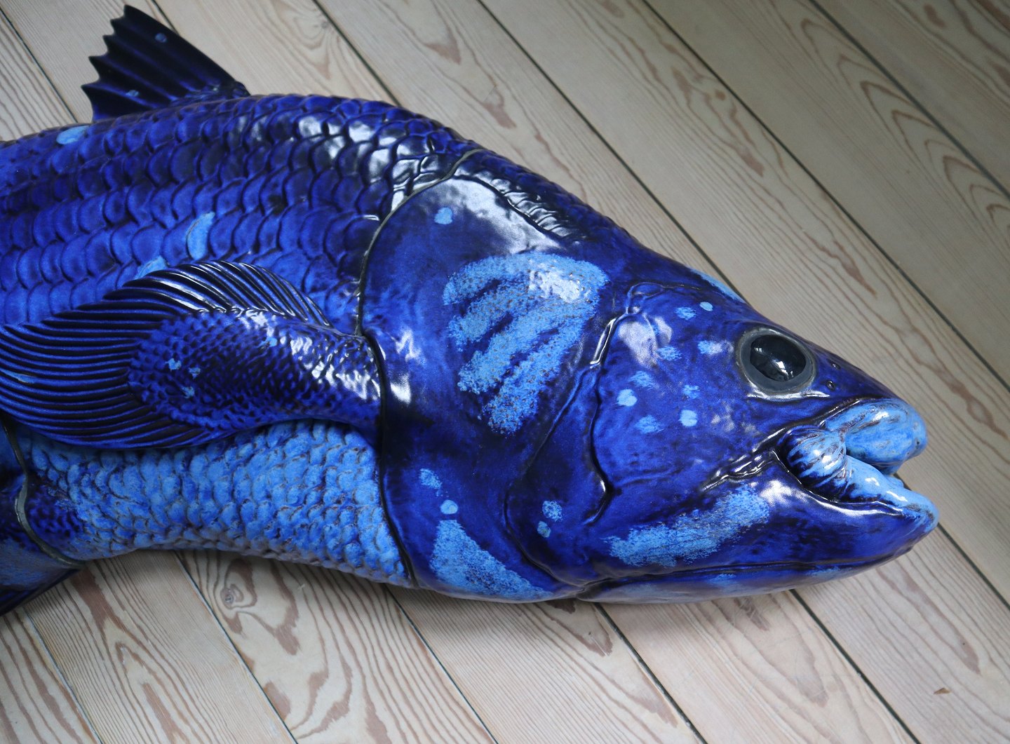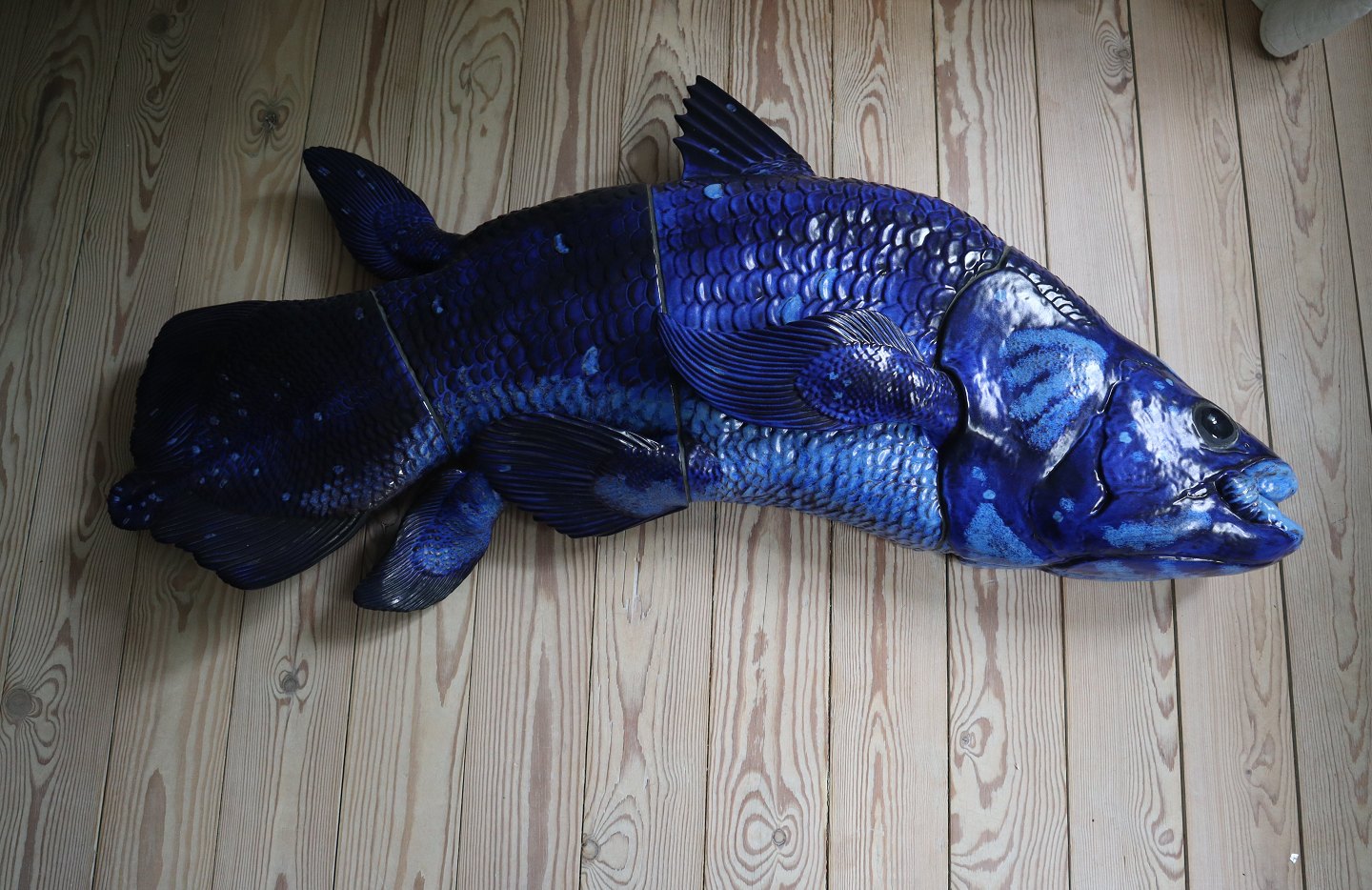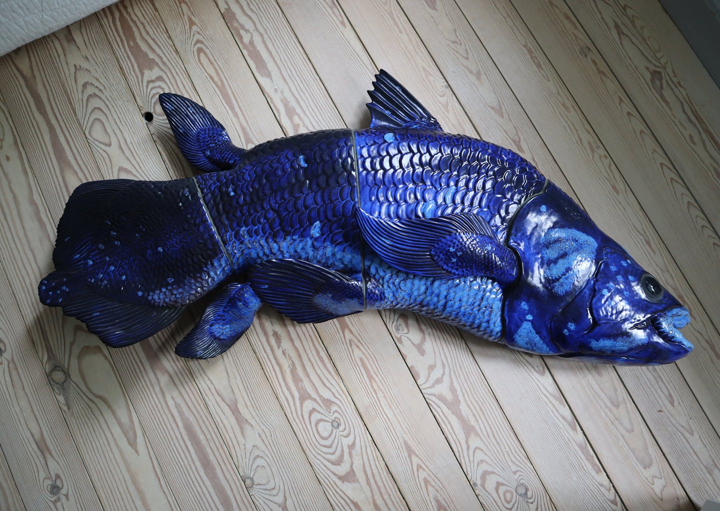 Beskrivelse: Aluminia Den Blå Fisk af Jeanne Grut ca 100 cm lang
