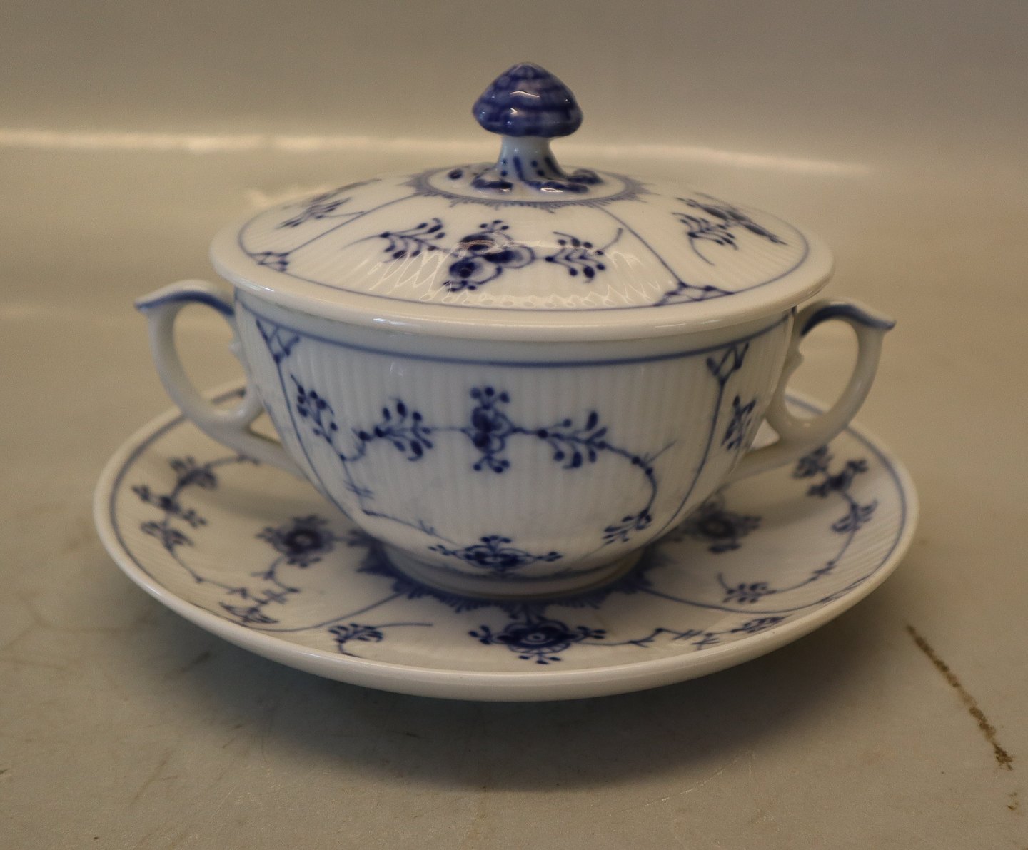 Beskrivelse: Royal Copenhagen Musselmalet riflet 2199-1 Bouillonkop uden låg med underkop 16.5 cm . Muselmalet I fin og hel stand. Passer godt sammen med andre blåmalede spise- og kaffestel