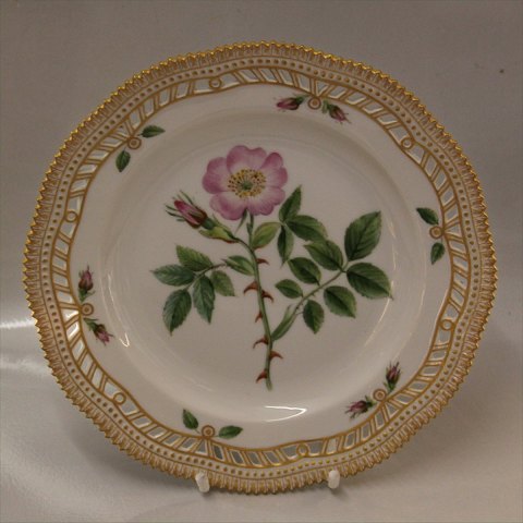 Beskrivelse: Royal Copenhagen Flora Danica 20-3554 Rosa Canina L. Fad til lille rund frugtkurv, flad tallerken med gennemskåret bort 23 cm Blomstermotiver på guldbelagt perlestel. 1. sortering i fin og hel stand