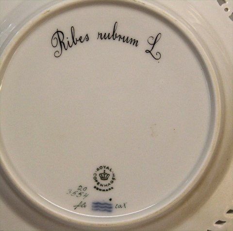 Description: Royal Copenhagen Flora Danica 20-3554 Ribes rubrum L. Stand for Small Round Fruit Basket/Pierced Lunch Plate New # 635. (From the year 1975) 9". Floral decoration on pearl pattern with gold rim. Factory first and in nice and mint condition