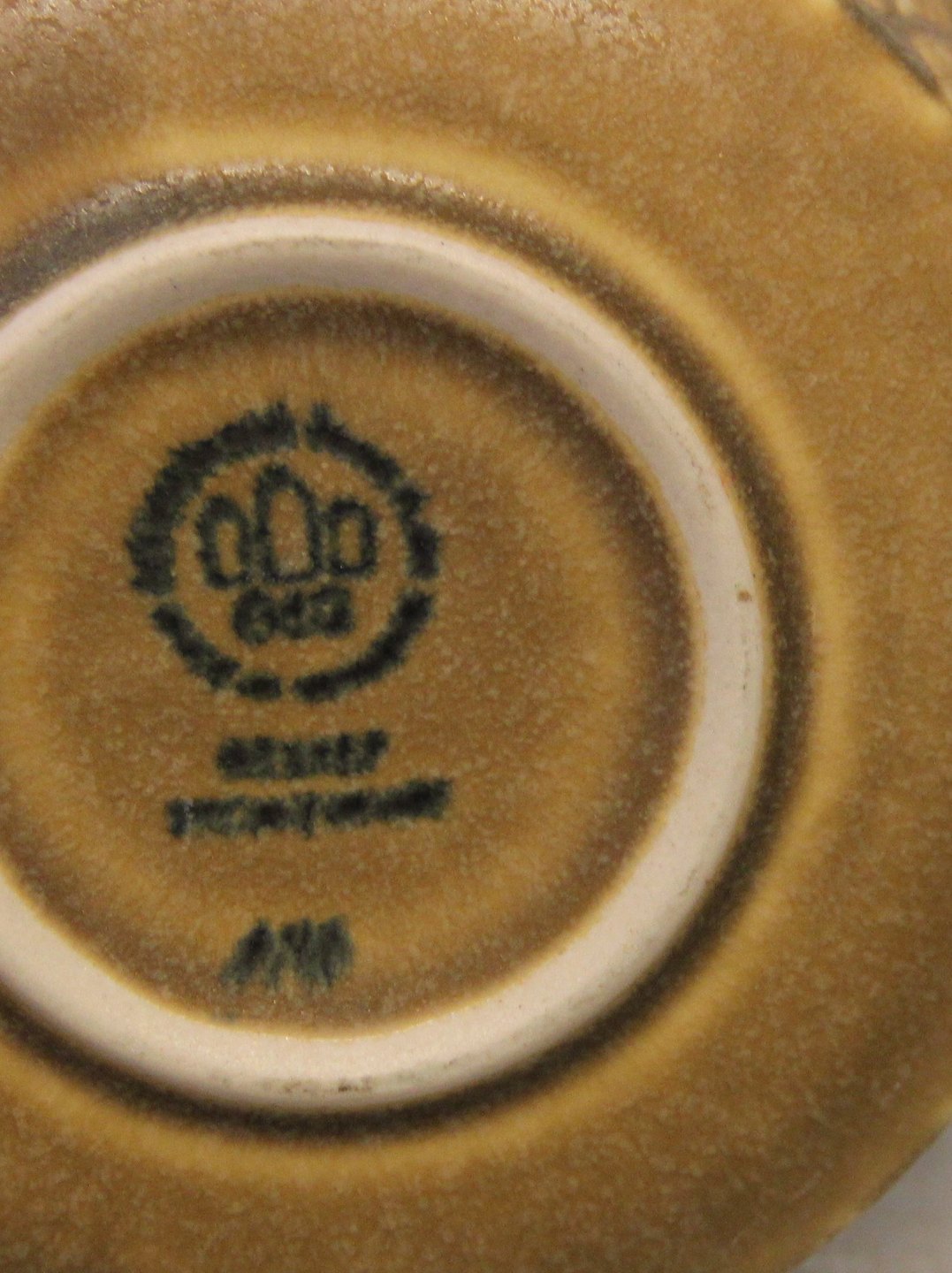 Bing & Grøndahl B&G Relief 574 Skål 5.5 x 13 cm Quistgaard Nissen Kronjyden stentøjsstel. I fin og hel stand. Bing & Groendahl. Stemplet Kronjyden eller Bing & Grondahl Copenhagen Stoneware: Bladformet mønster i releif på gult stentøj af Quistgaard for Kronjyden, Nissen.