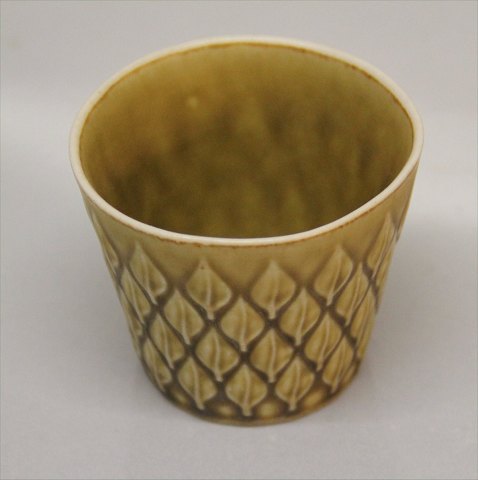 Bing & Grøndahl B&G Relief 672 Krukke 6 x 7 cm Quistgaard Nissen Kronjyden stentøjsstel. I fin og hel stand. Bing & Groendahl. Stemplet Kronjyden eller Bing & Grondahl Copenhagen Stoneware: Bladformet mønster i releif på gult stentøj af Quistgaard for Kronjyden, Nissen.