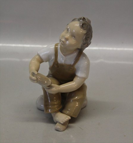 : Bing & Grøndahl B&G 2275 Dreng med sko 14 cm "Hjælp mig mor!" brun I fin og hel stand.