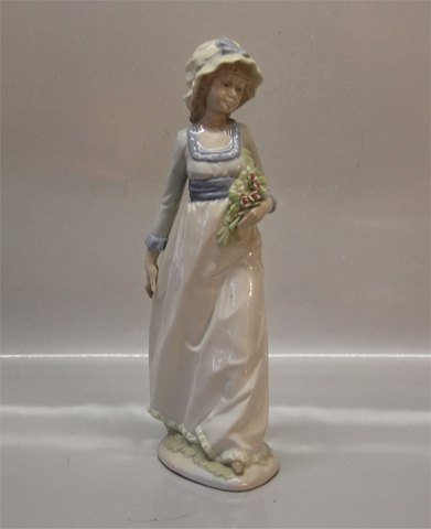 Beskrivelse: Stor Spansk figur Nadal: Pige med kyse og blomster 34 cm I stil med Lladro, Dao, Nao fra Spanien Mærket Nadal Handcrafted Spanish Porcelain