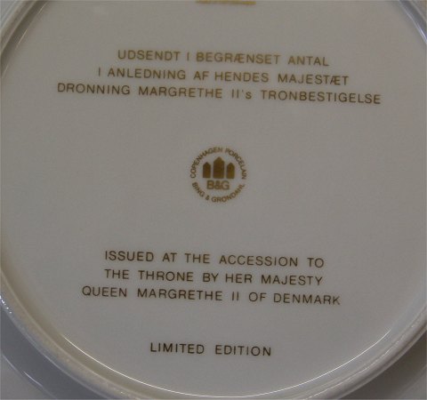 Bing & Grøndahl Platte B&G 1972 Danmarks Dronning Margrethe II, 14 Januar I anledning af Tronbestigelsen 24 cm