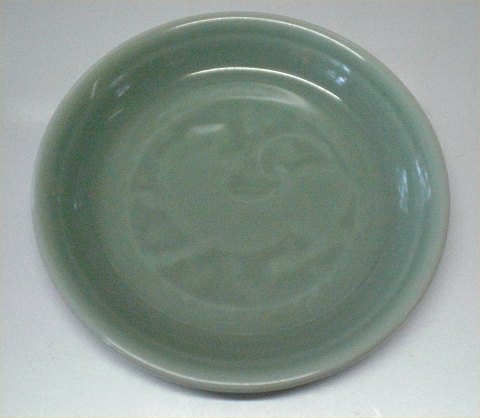 1979-1 Kgl. Celadon glaseret skål 18 cm med fabelløve i relief- Signeret FG or TG