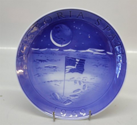 # Kongelig mindeplatte RC-CM 324 1969 Måneplatte. Månelandskab med fodspor og amerikansk flag. Indskrift: VICTORIA SPATII 1969 (besejring af rummet). Fremstillet I anledning af amerikanske astronauters første landgang på månen. Tegnet af Sven Vestergaard. 18 cm.