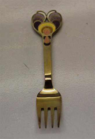 Beskrivelse: Anton Michelsen Julegaffel 1972 Budbringer Forgyldt sølv med emaljedekoration. Design: Bjørn Wiinblad