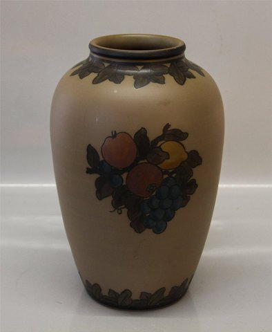 Beskrivelse: Bornholm, Hjort Keramik Stor Brun Vase 28 cm frugt dekoration L. Hjort Bornholm, # 51