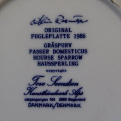 Tove Svendsen Fugleplatte 19.5 cm 1986 Gråspurv -Passer Domestic House Sparrow - Haussperling