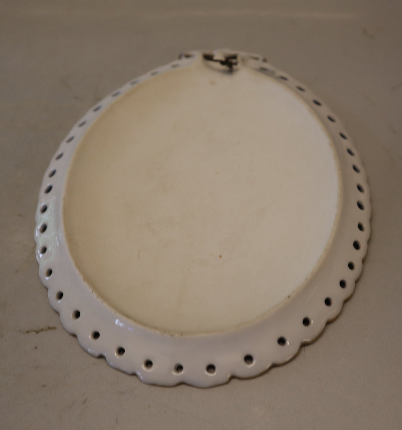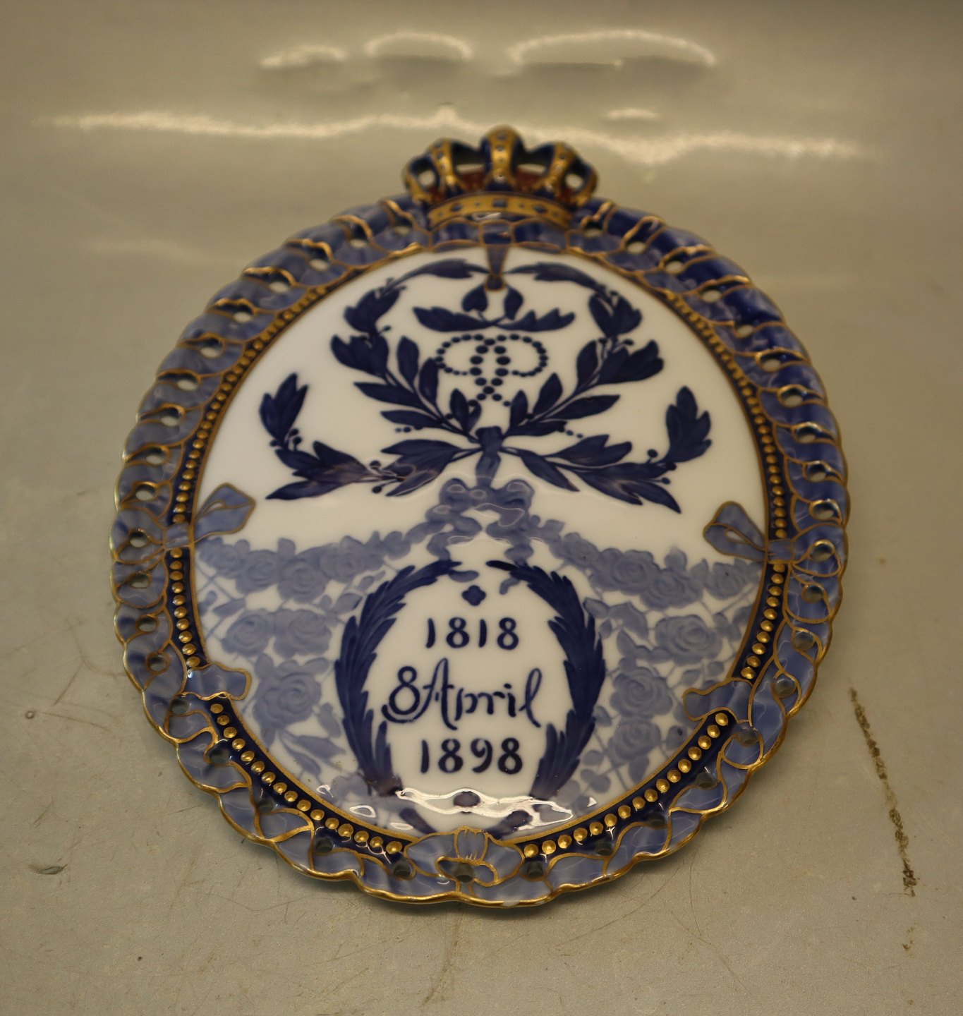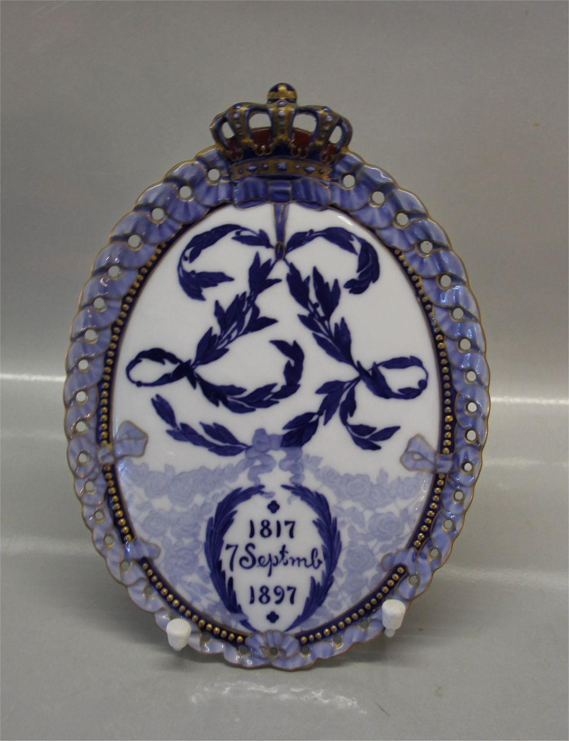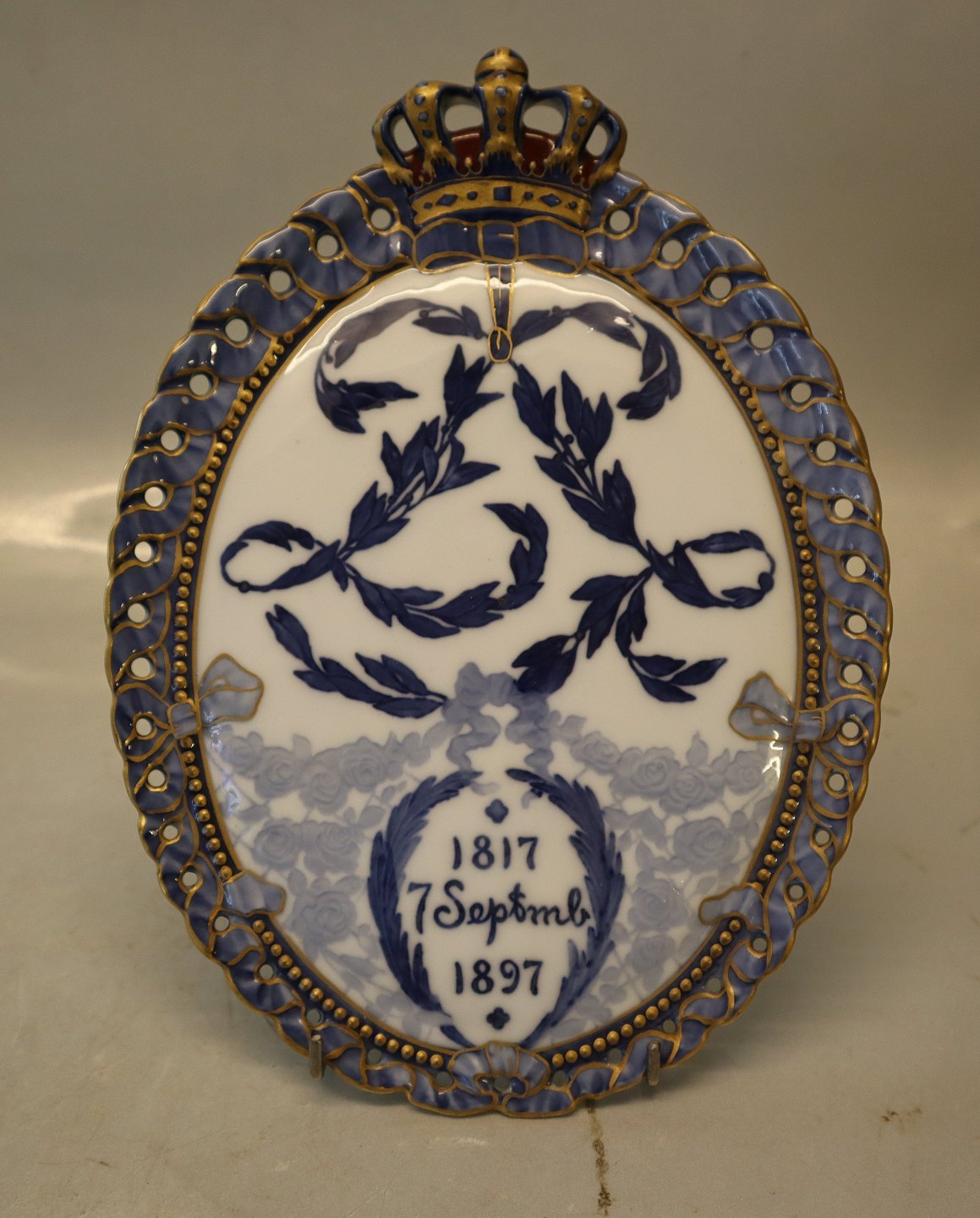 Beskrivelse: RC-CM #16a Dronning Louises 80 års dag. Oval platte med konet ramme I relief. Spejlmonogram L dannet af blade, derunder: 1817-7 Septmb.-1897. Design: Arnold Krog, 1200 eksemplarer 23,5 cm Royal Copenhagen mindeplatter også kaldet lejlighedsplatter fremstillet til særlige lejligheder eller på bestilling. Dem kongelige porcelænsfabrik har fremstillet over 500 forskellige.