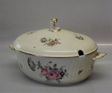 Beskrivelse: Royal Copenhagen Frijsenborg Blomstermotiver på svejfet stel med guldkant 1666-910 Terrin, oval med låg 19 x 32 cm.