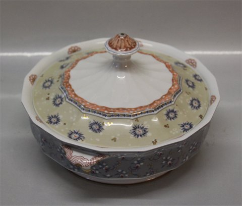 . Inspireret af Gerhard Hennings figurer af samme navn. Et kompleks flerfarvet transfer mønster på den kantede form som Blå Blomst Kantet. Design Finn Næss-Schmidt og Jørgen Nielsen. De grå dele har nummer 1201, terrakotta 1202 og serveringsdele med lidt af hvert 1203.