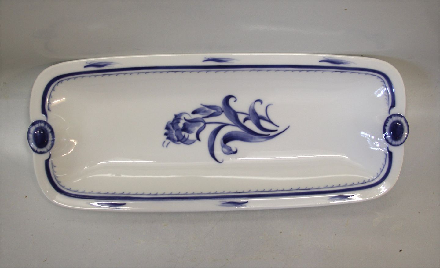 Bing & Grøndahl Jubilæumsstellet 205 Sellerifad 40 x 16 cm (378) : Blå nellike, hvid, underglasur, form 595 Rouladefad, Aspargesfad Perfekt til mange slags serveringer