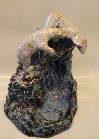 Beskrivelse: Kæmpe Bjørnegruppe r glasur ca 40 x 40 cm Søren Kongstrand og Jens Pedersen Kæmpe figur med to Isbjørne på klipper