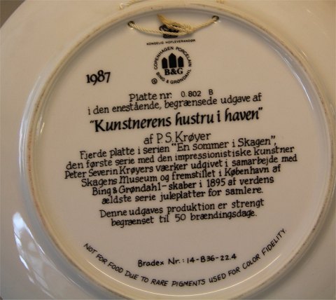 Bing & Grøndahl platter fra Skagensmalerne B&G 1987 Sommer i Skagen Plate # 4. "Kunstnerens hustru i haven" P.S. Krøyer 21 cm
