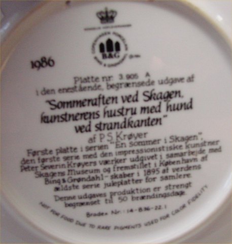 B&G Kunstnerplatter Sommer i Skagen B&G 1986 Sommer i Skagen platte nr. 1. "Sommeraften ved Skagen: Kunstneren hustru med hund i strandkanten. PS. Krøjer 21 cm