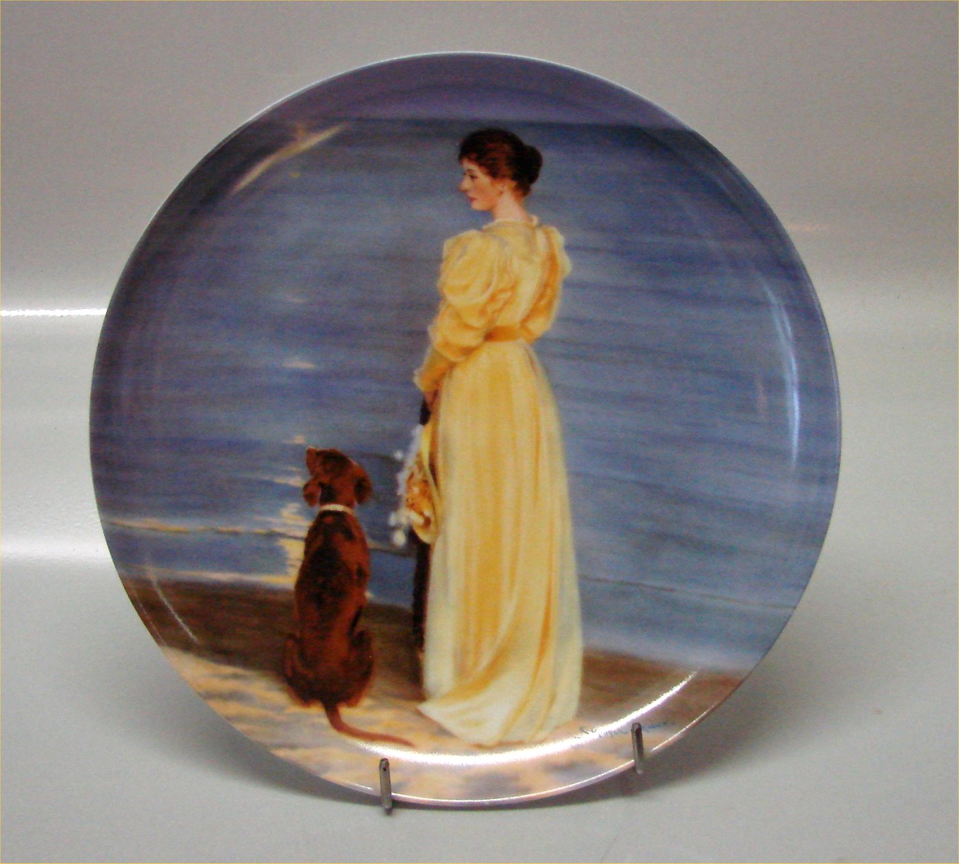 Beskrivelse: Bing & Grøndahl platter fra Skagensmalerne B&G 1986 Sommer i Skagen platte nr. 1. "Sommeraften ved Skagen: Kunstneren hustru med hund i strandkanten. PS. Krøjer 21 cm