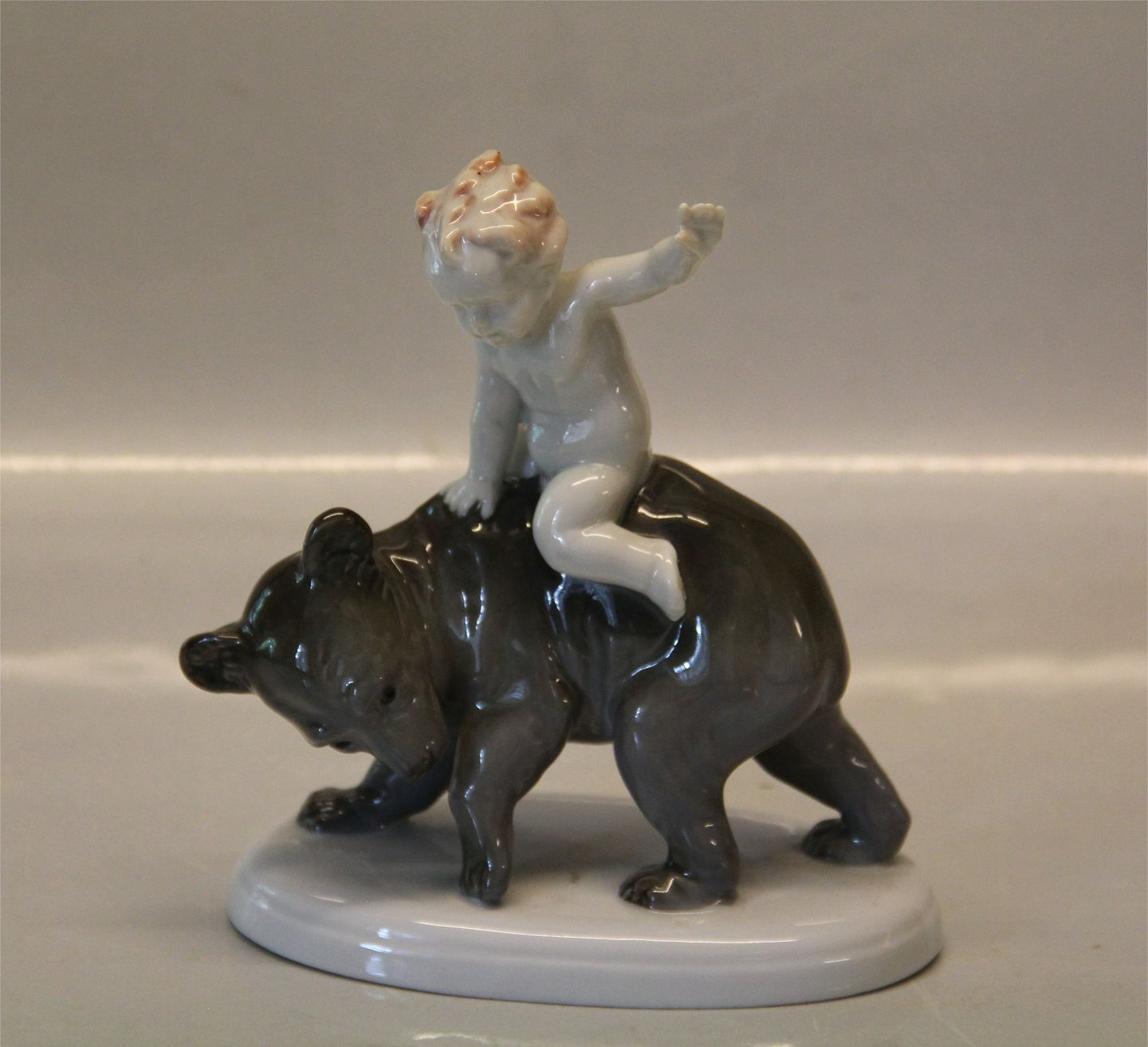 : Tysk porcelænsfigur Metzler Ortloff figure Dreng på bjørn 14 x 13 cm