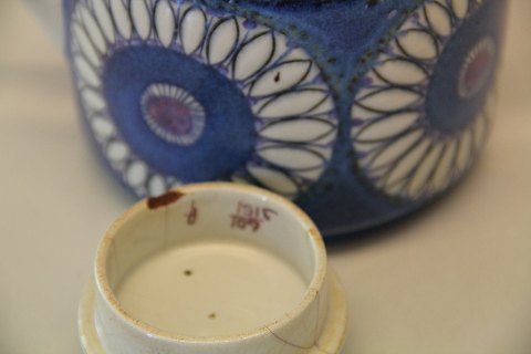 Beskrivelse: Royal Copenhagen Aluminia fajance 601-3151 Tekande 3/4 L Berte Jesen 1962 Anette, Minimalt skår på tud og skåret låg