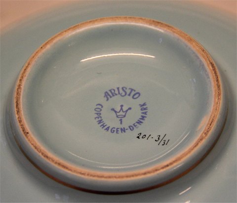 Beskrivelse: Aritsto Copenhagen Skål 201-3-31 Blomster på gren 8 x 18 cm mint grøn glasur med guld og blomster I relief