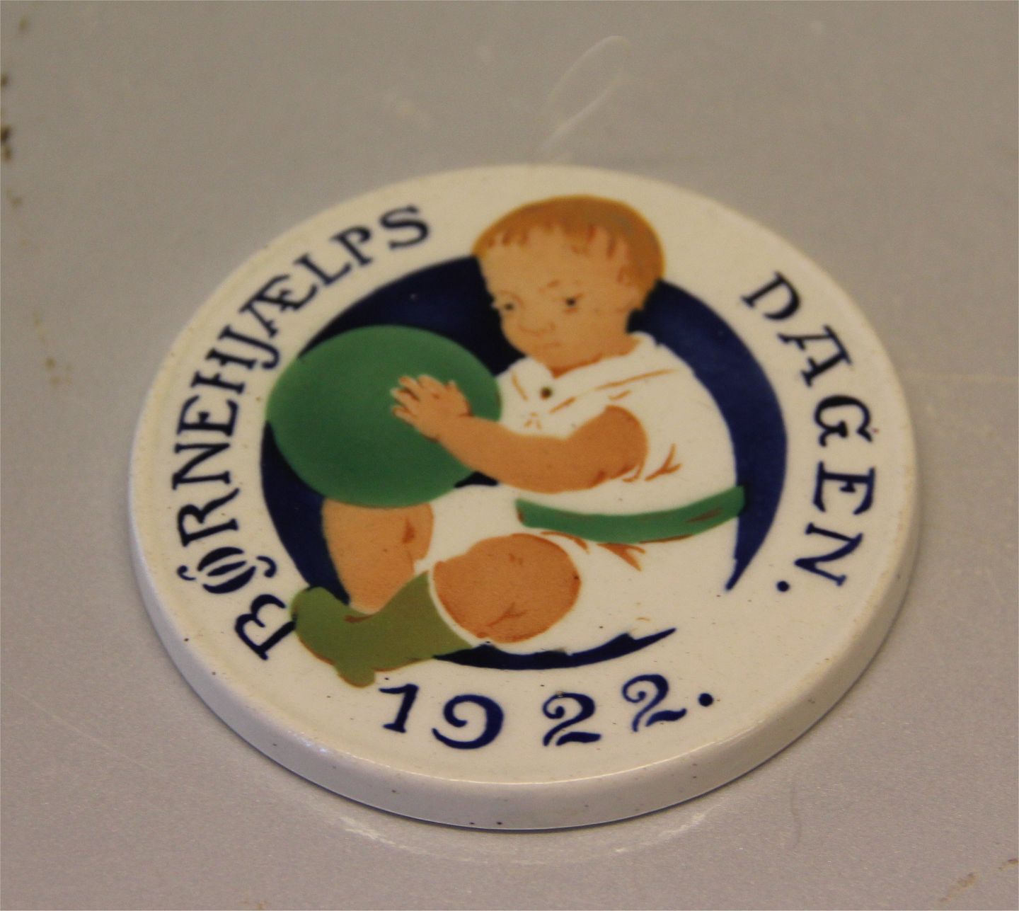 Beskrivelse: 1922 Dreng med bold Oscar WIllerup 8, 7 cm Aluminia kunstfajance Aluminia Fajance Børnehjælsplatter Børnehjælpsplaketter 1905, 1909-1913 Håndmalede. 1914 - 1930 Luftmalede.