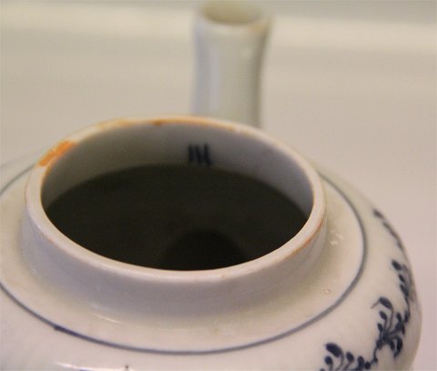 Beskrivelse: Kongelig Dansk Porcelæn Musselmalet Stjertkande med ibenholt hank men uden låg ca 5,7 cm -limning på hank . hank limet og lidt små afslag intet låg Blue Fluted