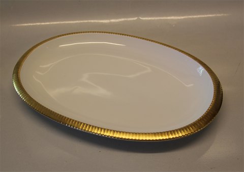 016 Stegefad 34 x 23 cm (316) Golden Sun - Gylden Sol. Form 674 er formgivet af Sigward Bernadotte. Denne form findes i hvidt, med bred guldkant (Gylden Sol), med smal guldbelægning på inderkanten (Vega), med grønt og guld (Perseus), med rødt og guld (Herkules) og beige og guld (Norma).