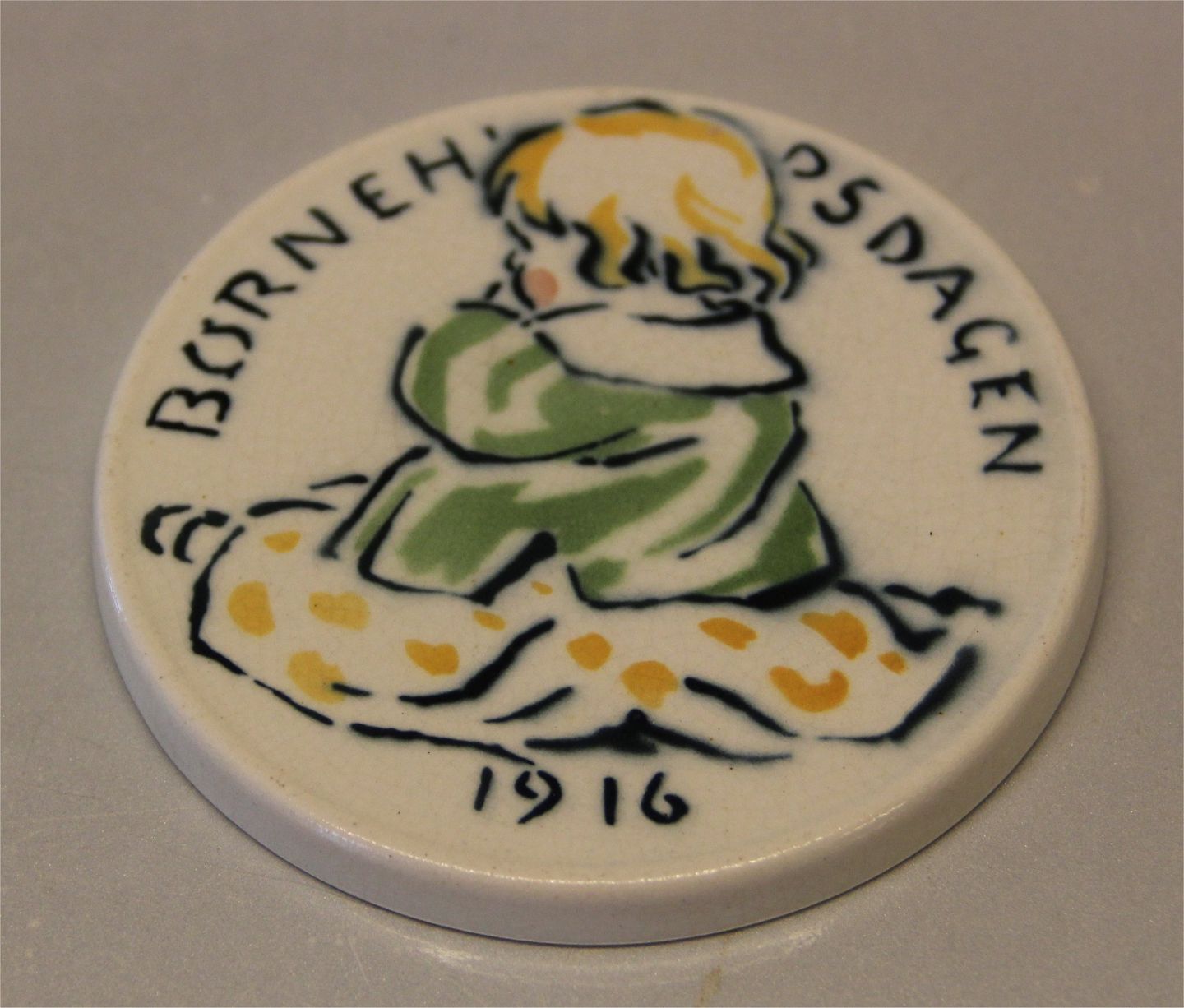 1916 b Siddende barn 8,7 cm Oscar Willerup Royal Copenhagen Aluminia fajance Børnehjælpsplatte 1916