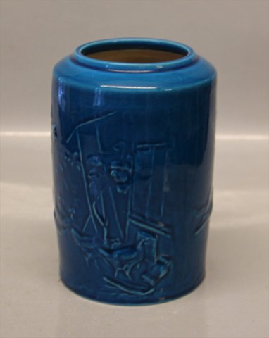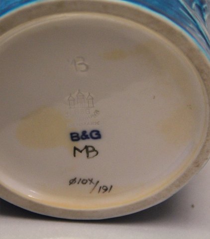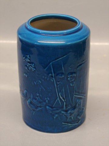 B&G Art Pottery Bing & Groendahl B&G 19-191 Turquoise glazed vase with chicken 15.5 cm Mogens Bøggild Signered MB