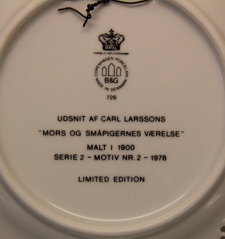 Bing & Grøndahl Carl Larson B&G 8726 1978 Carl Larssons platte - serie 2 - Motiv nr. 2. -"Mors og småpigernes værelse" Malt i 1900