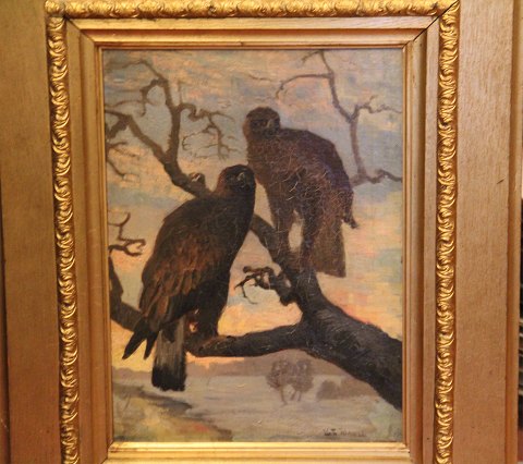 Maleri Rovfugle på gren Oliemaleri på Lærred ca 60 x 49 cm inklusiv original guldramme Vilhelm Th. Fischer 1857 - 1928