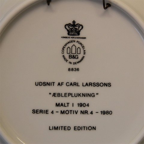 Bing & Grøndahl Carl Larson B&G 1980 Carl Larssons platte - serie 4 - motiv nr. 4 "Æbleplukning" Malt i 1904, 21,5 cm