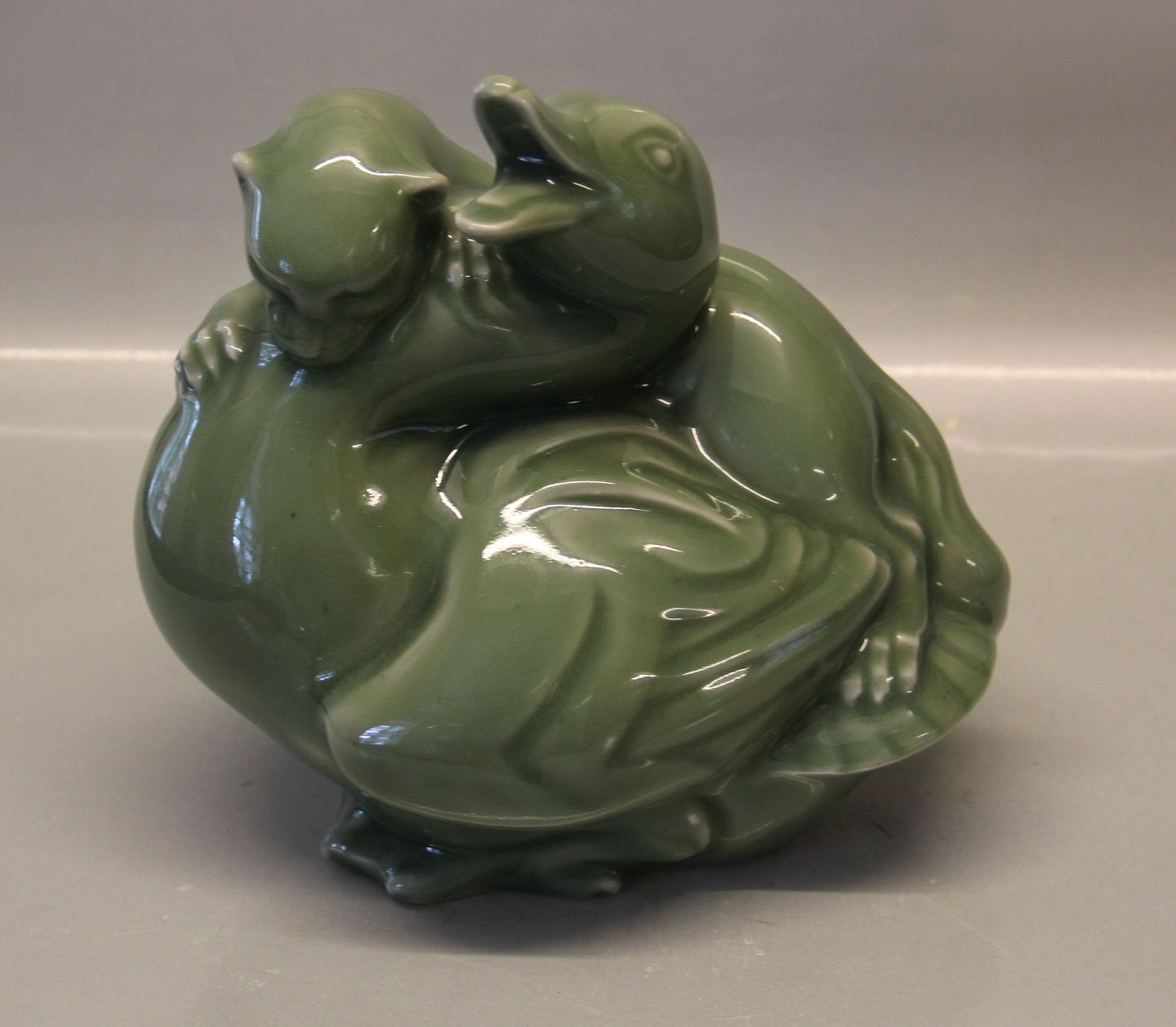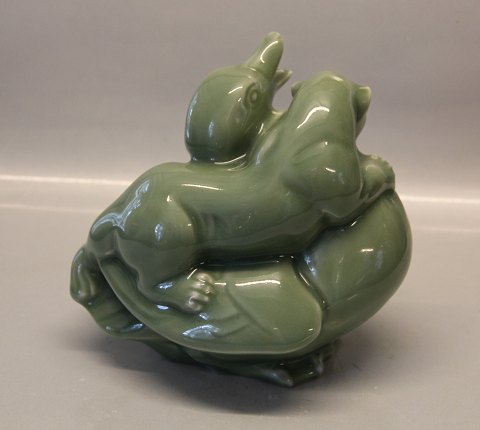 Beskrivelse: Royal Copenhagen stentøj 3108-1 Kgl. And og Ilder 20 x 21 cm Knud Kyhn Celadon I fin og hel stand