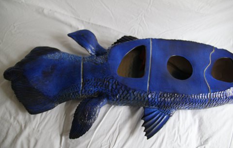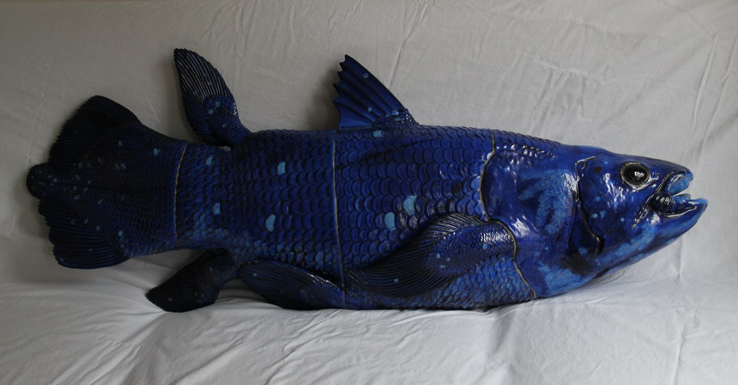 Billedhugger Jeanne Grut har ladet sig inspirere af Coelacanthen og har modelleret en relief skulptur af denne fisk. Det blåglaserede stykke giver beskueren et overvældende indtryk af en forunderlig ting - et levedygtigt fossil - en virkelig fabelfisk - en dyrefigur, som næsten må have levet siden verdens skabelse