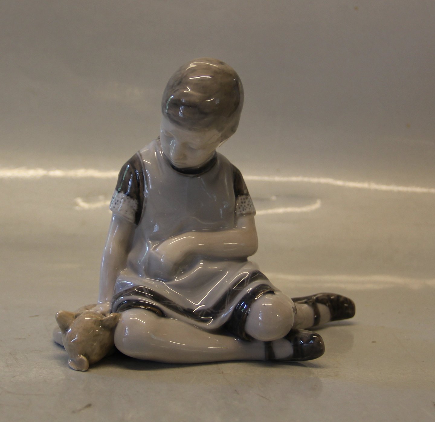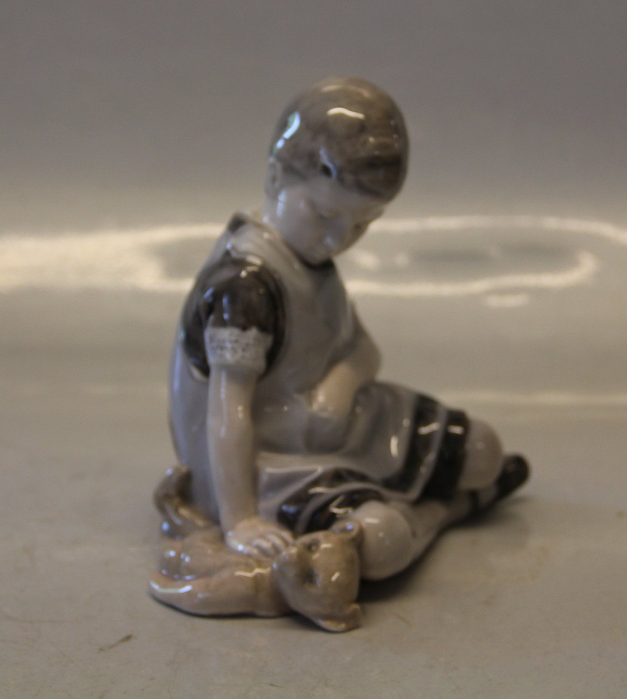Beskrivelse: Kgl. figur fra Royal Copenhagen 1879 Kgl. Pige med teddy bamse 13 x 15 cm Carl Martin Hansen 1917 Eneste kendte underglassur figur af Carl Martin Hansen som elelrs er kendt for overglassur figurer af mennesker i nationaldragter og egnsfigurer. I hel og fin stand