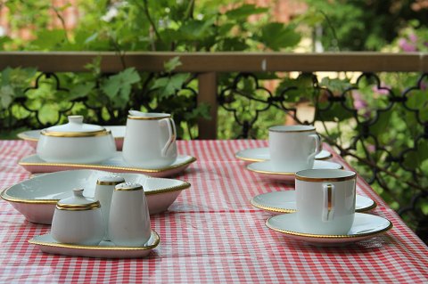102 Kaffekop 7 x 6.7 cm og underkop 14 cm1,25 dl (305) Golden Sun - Gylden Sol. Form 674 er formgivet af Sigward Bernadotte. Denne form findes i hvidt, med bred guldkant (Gylden Sol), med smal guldbelægning på inderkanten (Vega), med grønt og guld (Perseus), med rødt og guld (Herkules) og beige og guld (Norma).