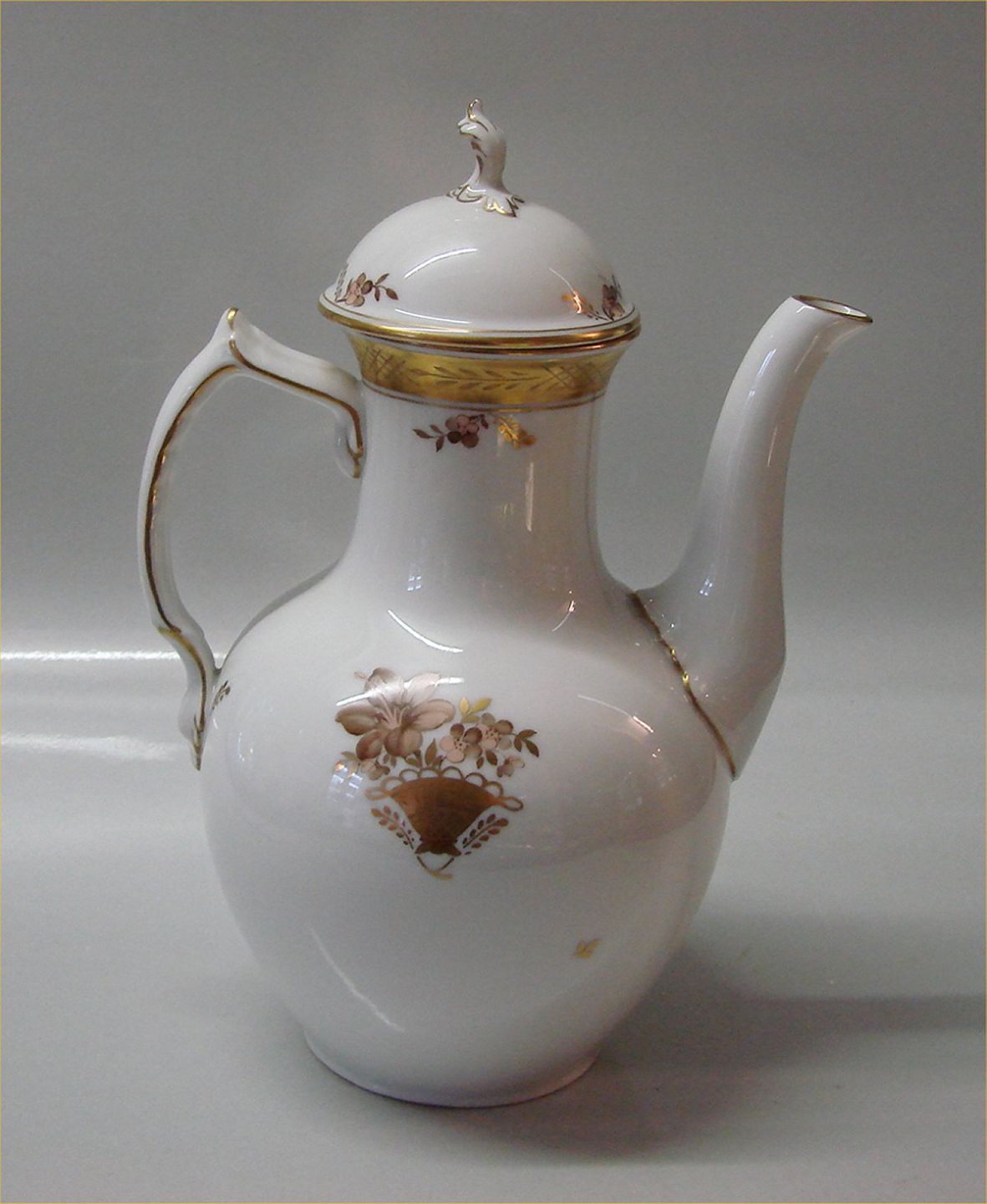 9233-595 Kaffekande Kgl. Royal Copenhagen Guld dekoration på hvidt porcelæn 1927. I hel og fin brugt stand Golden Basket