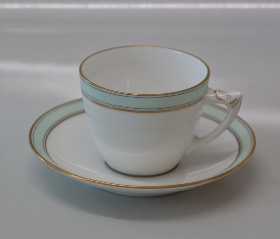 102 Kaffekop og underkop 1,25 dl (305) Form 469 Verdi Bing & Grøndahl I fin og hel stand. Hvidt porcelæn, lysegrønt bånd, sorte linier og guldkant, form 469 og form 601